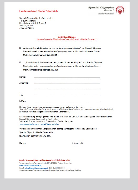 Hier das Formular für den Mitgliedsbeitrag, damit du bei Special Olympics Niederösterreich unterstützendes Mitglied werden kannst.